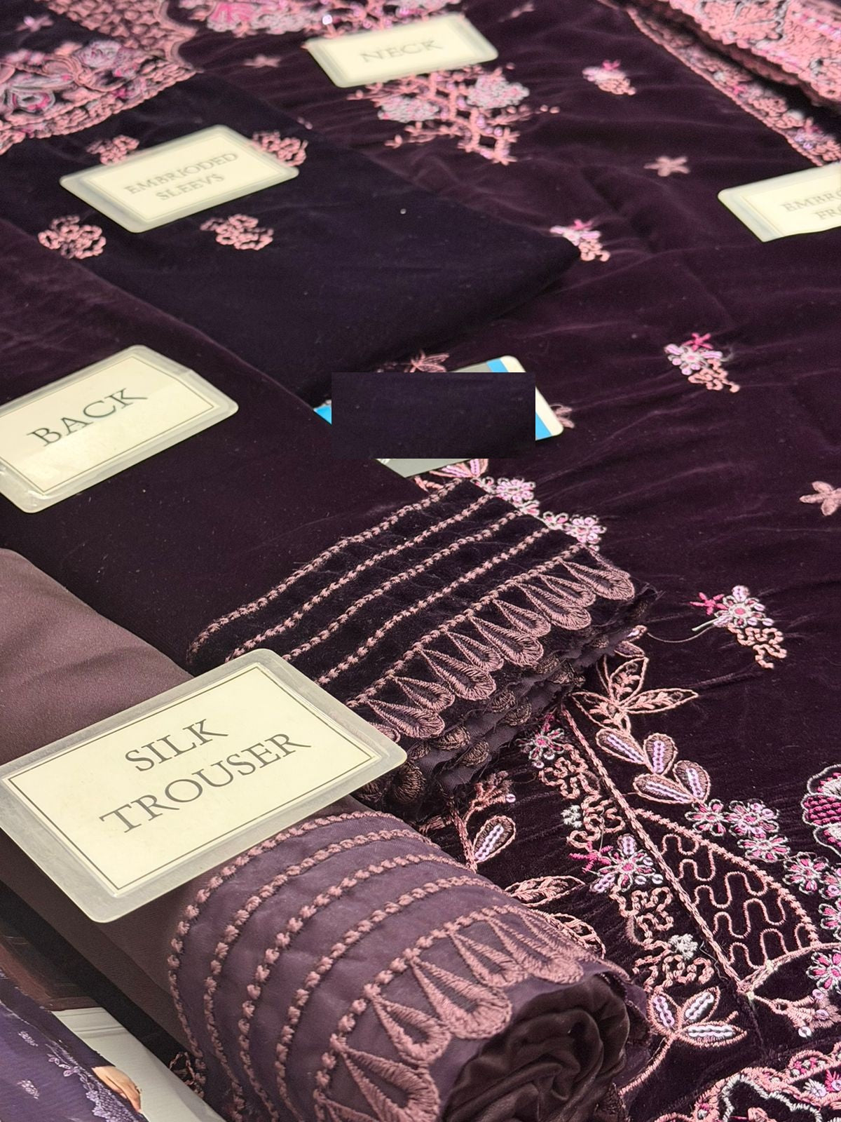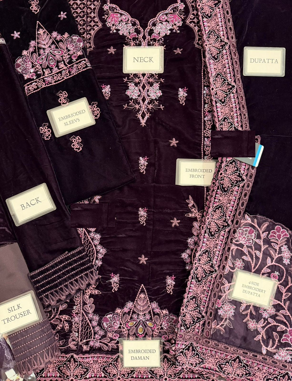 VELVET fully heavy embroidered spengle work centre panel front with fully heavy embroidered spengle work left & right panel attach with embroidered spengle work daman boarder