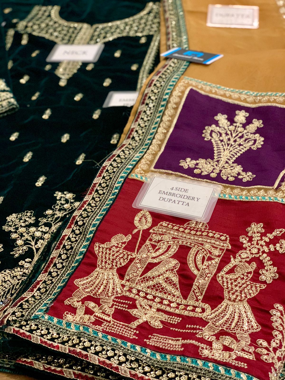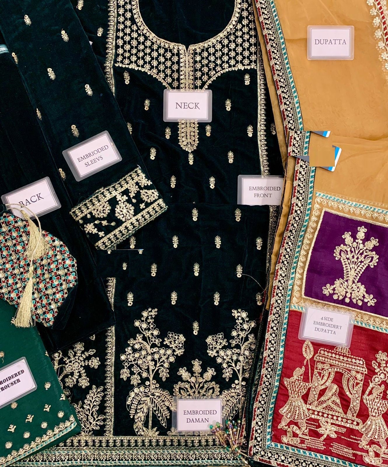 Velvet fully heavy embroidered spengle work centre panel with fully heavy embroidered spengle work left & right panel attachment with velvet embroidered spengle work daman boarder